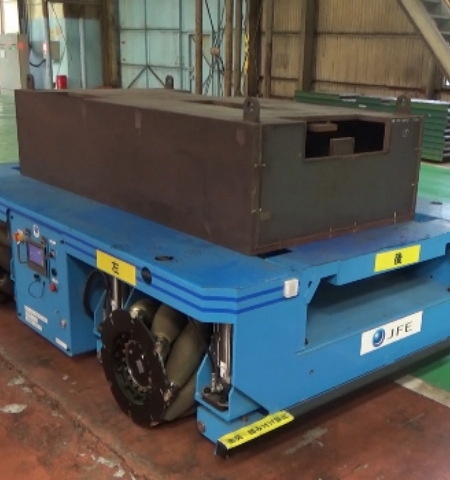 Machinery parts being transported by the robot (at a JFE Engineering plant)
