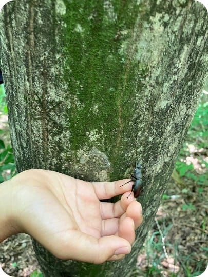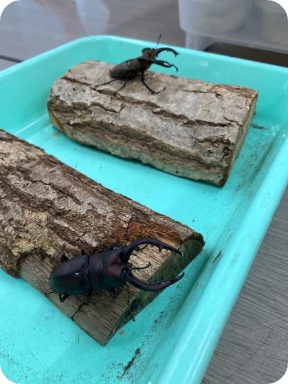 の声子供たちが、自ら飼育・放虫したクワガタが元気に木を登っていく様子を嬉しそうに見つめる姿が印象的でした。