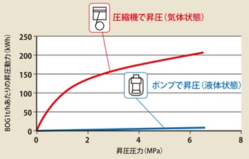 従来、BOG処理には高圧仕様の圧縮機を使用していたが、その動力(電力消費量)はLNG基地全体の約3分の1程度を占めていた。BOGを液化してポンプで昇圧する場合の動力が、気体のまま圧縮機で昇圧する場合に比べて大幅に動力を削減できるため(図1)、払出LNGの冷熱を利用してBOGを再液化してからポンプ昇圧するシステムの導入検討を行った。