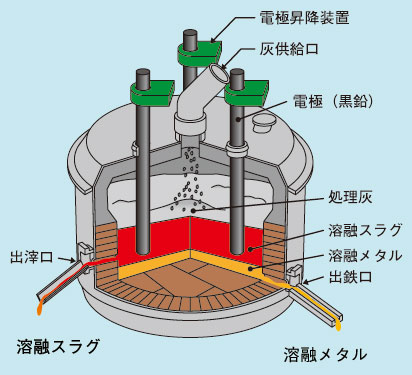 炉内に設けた電極間に交流電圧をかけることで灰自体が抵抗体となって電気抵抗熱が発生し、安定的で穏やかな溶融が行えます。加えて、炉底部に高さを変えた排出口を設けることで、スラグとメタルが比重分離して排出されるため、きわめて良質なスラグを得ることができます。さらに溶融炉を出たガスは還元雰囲気にあるため、有害ガスの生成が抑えられ、また灰に含まれる重金属もほとんどが溶融飛灰として捉えられ、資源として回収できることが特長です。