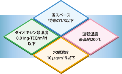 吸着能に優れた粒状の活性炭で活性炭層を形成して排ガスを通過させるため、活性炭噴霧方式では達成困難なダイオキシン類濃度0.01ng-TEQ/m3N以下、水銀濃度10μg/m3N以下が可能となりました。