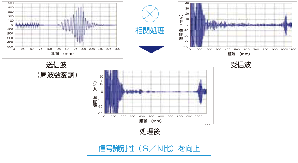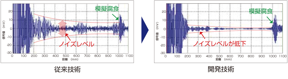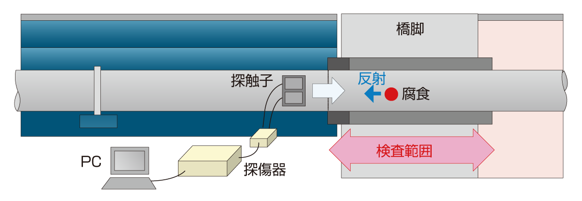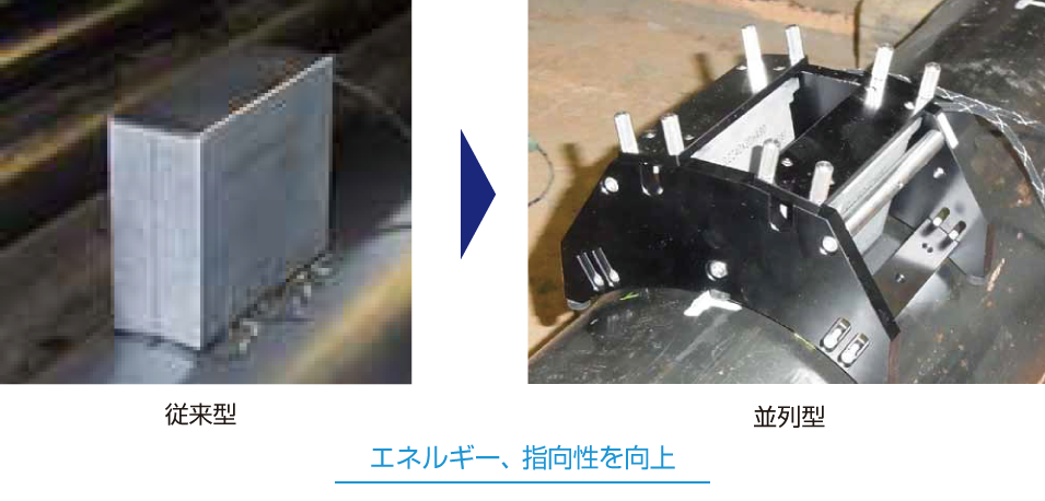 - 特殊な超音波(ガイド波)を利用することで、通常の超音波探傷法と比べ広範囲な計測を可能としました。