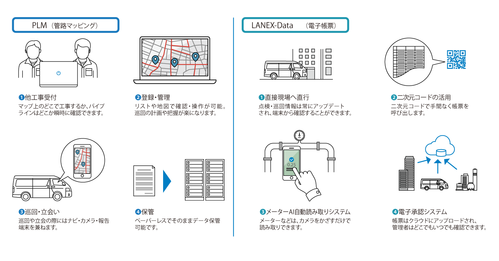 パナシーアは、マップ画面でデータを一元管理できる「PLM」、保守データをデジタル管理する保守点検電子帳票「LANEX-Data」を組み合わせ、管路や施設の保守点検の高効率化をサポートします。